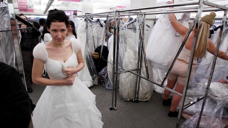 Tradicionalno znižanje poročnih oblek v New Yorku je znova privabilo mnogo navdušenih bodočih nevest. googletag.cmd.push(function() { googletag.display('divInArticle'); });