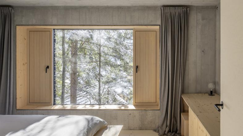 Spodnja, polvkopana betonska etaža ustvarja trden temeljni podstavek, medtem ko zgornji leseni volumen s svojo konstrukcijo in vidnimi bukovimi mozniki poudarja ekološko zavezanost, panoramsko okno pa vključi naravo kot najizrazitejši element interjerja.