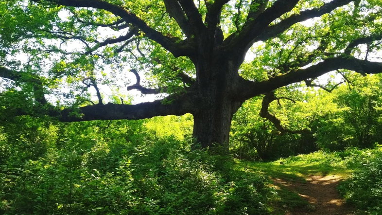 Naslednjič mi dih zastane, ko se sredi gozda pred mano razprostre velikanski hrast. Njegove debele, ravne veje, segajo daleč naokoli. To je najstarejši in največji hrast na otoku. Stoji sredi majhne jasice v gozdu, ki jo senčijo njegove veje. Obsedim.
