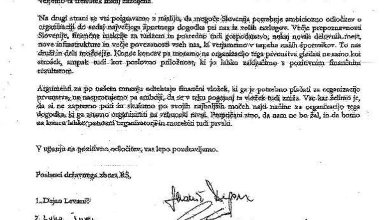 "Mogoče Slovenija potrebuje ambiciozno odločitev o organizaciji do zdaj največjega športnega dogodka pri nas," vladi sporoča 39 poslancev državnega zbora, ki so "prepričani, da nam ne bo žal in da bomo na koncu lahko ponosni organizatorji in morebiti tudi prvaki".
