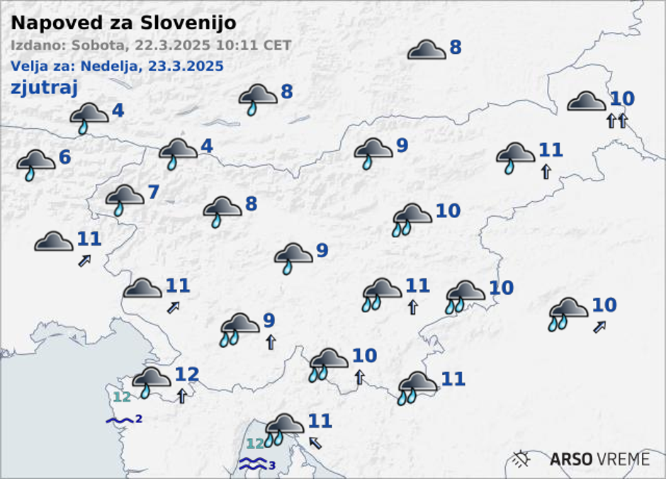 Ponoči pa se bodo padavine na zahodu nekoliko okrepile in prehodno razširile nad večji del Slovenije. Ob morju bo zapihal zmeren jugo. Najnižje jutranje temperature bodo od 8 do 12, v Zgornjesavski dolini okoli 4 °C, napovedujejo.