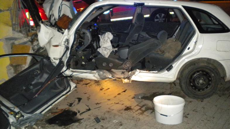 Zaradi neprilagojene hitrosti je zapeljal na hitrostno oviro in trčil v rob pločnika, zaradi česar je vozilo odbilo v levo čez pločnik na travnato površino ob vozišču, nato pa je silovito trčilo v vogal poslovnega objekta.