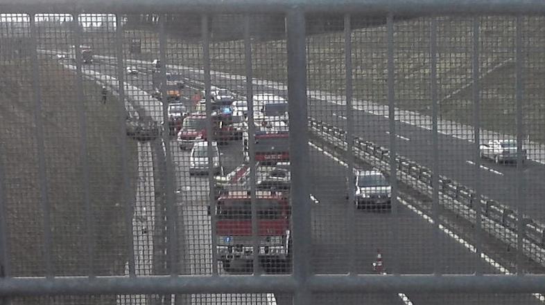 Na dolenjski avtocesti pred počivališčem Starine v smeri Obrežja okrog 14. ure nesreča dveh vozil. Eno je obstalo na strehi. Enega poškodovanega udeleženca odpeljali v bolnišnico.