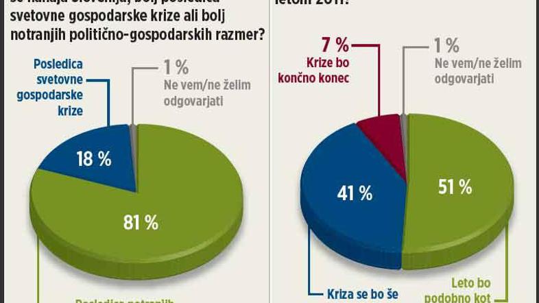 Kriza. Kar 81 odstotkov Slovencev meni, da je trenutna kriza v Sloveniji posledica notranjih razmer, le 18 odstotkov pa, da je posledica svetovne gospodarske krize. Tako je pokazala Valiconova spletna anketa, ki jo je med 531 anketiranci opravil med 27. oktobrom in 4. novembrom.