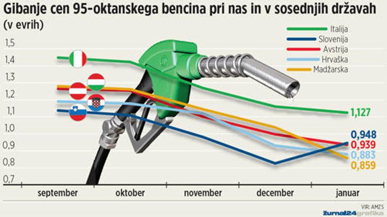 Pri vseh naših sosedah se je januarja bencin pocenil. Slovenci smo ga podražili.
