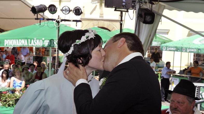 Danes dopoldan sta se kot 42. par na letošnji prireditvi Pivo in cvetje po starih šegah poročila Nataša in Jože Ojsteršek, ki sta imela po naključju, še preden ju je laški župan Franc Zdolšek tudi uradno razglasil za moža in ženo, enak priimek. To sta storila pred številnimi svati in drugimi obiskovalci, ki so si tudi letos z zanimanjem ogledali, kako so se možili in ženili nekoč.