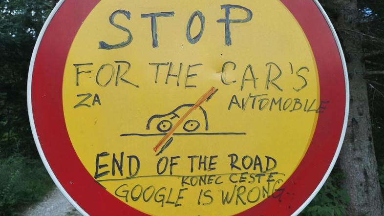 ''Stop za avtomobile. Konec ceste. Google se moti,'' je med drugim zapisano na znaku.