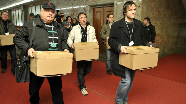 Predstavniki študentskih organizacij in Zveze svobodnih sindikatov Slovenije (ZSSS) so v vložišče državnega zbora pravkar prinesli okoli 47 tisoč podpisov volivcev.