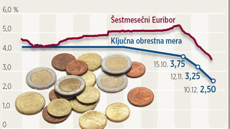 Od srede velja nižja ključna obrestna mera, ki jo je Evropska centralna banka (ECB) prejšnji četrtek znižala s 3,25 na 2,5 odstotka. Tako nizko je bila nazadnje pred dobrim desetletjem. Z nižanjem obrestnih mer želi ECB povrniti zaupanje v finančni trg, ki je ključno za nemoteno delovanje nekega gospodarstva, pravi Aleš Ipavec iz Hypo Alpe-Adria Bank. Nekateri menijo, da je glede na trenutne razmere ECB s temi ukrepi nemočna. Napovedujejo, da se bo ključna obrestna mera še naprej zniževala, vrhunec pa naj bi dosegla pri okoli ena do 1,5 odstotka. Obrestne mere naj bi začele spet rasti v letu 2010, ocenjuje Ipavec.