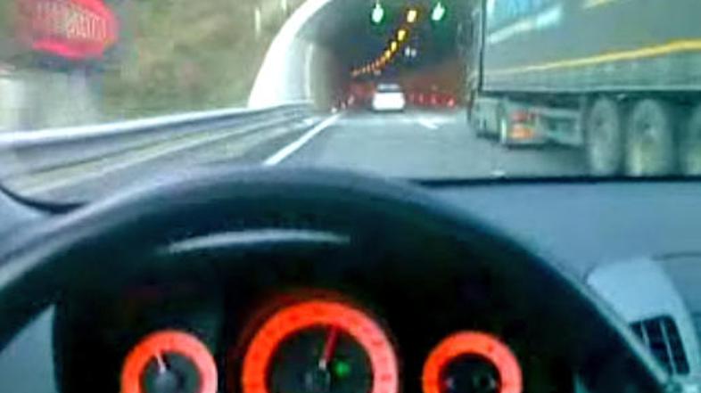 V uredništvo smo prejeli posnetek, ki prikazuje, kako policijsko vozilo prevozi predor pri hitrosti 120 km/h. Kasneje se policistu približa avtomobil s hitrostjo 180 km/h, vendar se policist na to ne odzove.