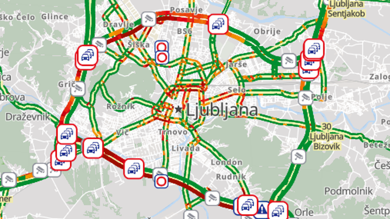 Ljubljanska obvoznica je obarvana v rdeče. Po poročanju prometno-informacijskega centra zaradi popoldanske prometne konice in prihajajočih praznikov nastajajo zastoji na cestah, ki vodijo iz mest in na mestnih obvoznicah. Zastoji so predvsem na ljubljanski obvoznici proti Primorski, Dolenjski in Štajerski.