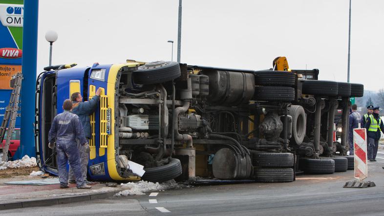 Voznik tovornjaka se je zaradi neprilagojene hitrosti v križišču Slovenske Bistrice prevrnil na bok. Na veliko srečo ni bilo poškodovanih.