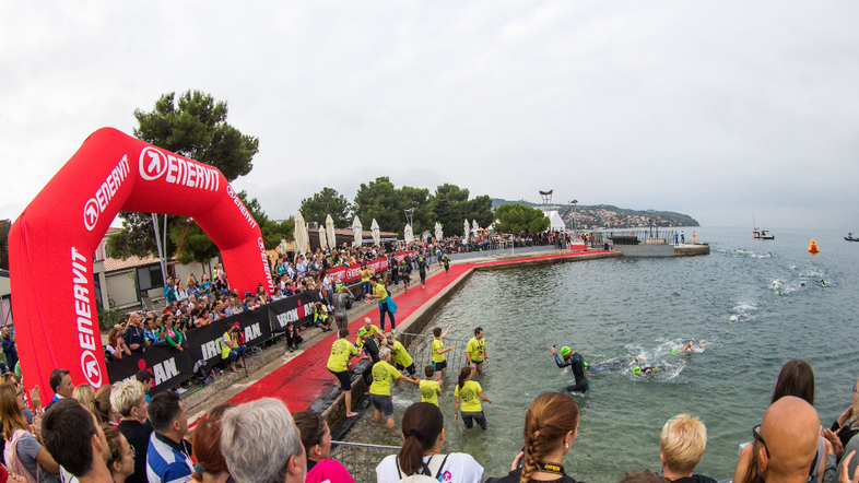 Tekmovalce je nato čakala zahtevna naloga. Na start se sicer niso podali vsi hkrati, v morje so v petsekundnih intervalih spuščali po pet tekmovalcev, ki so nato morali preplavati krog v zalivu, dolg 1900 metrov. Najhitrejši so bili že po dobre pol ure iz vode, sledila je naporna kolesarska preizkušnja. Marsikoga je pretreslo že na tlakovcih na Titovem trgu, kjer je ob ogradi končalo tudi veliko izgubljenih plastenk s pijačo.