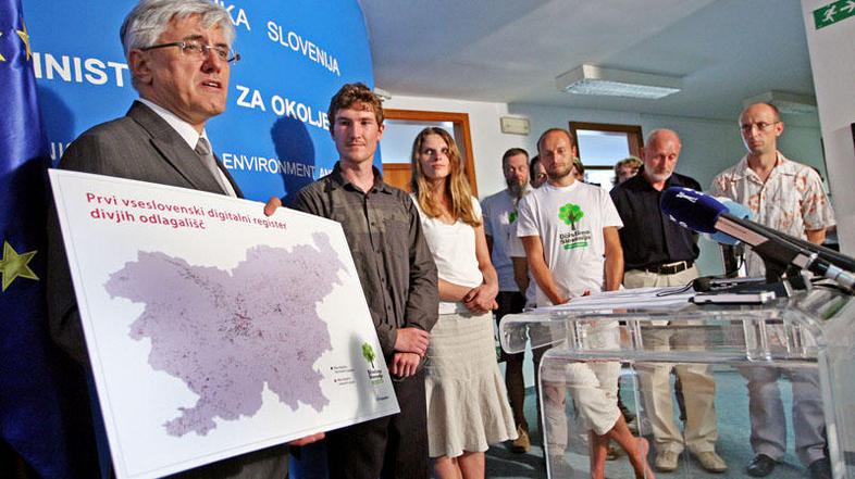 Organizatorji akcije Očistimo Slovenijo v enem dnevu in člani društva Ekologi brez meja so ministru za okolje Roku Žarniću simbolno predali Register divjih odlagališč Sloveniji.
