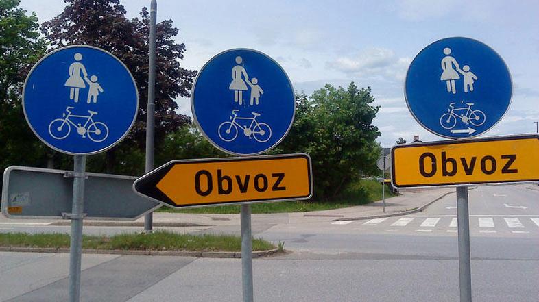 Ljubljana. Na križišču Litostrojske in Korotanske ulice stojijo trije znaki za pešče z obvozom. Zbrali pa smo še nekaj drugih zabavnih fotografij s prometnimi znaki.