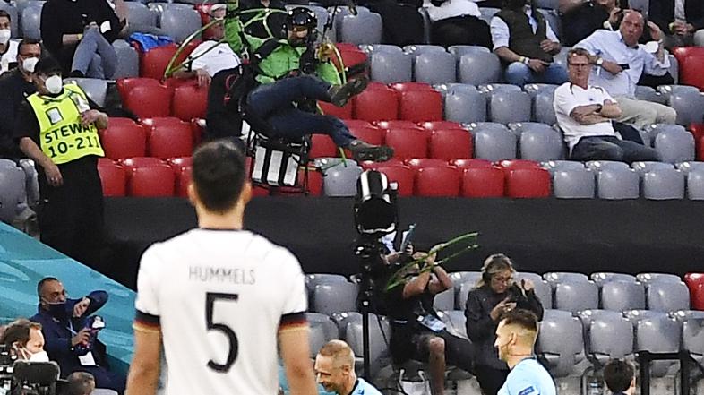 Can't believe I just caught this on video. Parachuted into the stadium, got caught in the spider cam and nearly crashed into the crowd. Hope he's ok! #GERFRA #EURO2020 pic.twitter.com/PJ49WYdFM9
