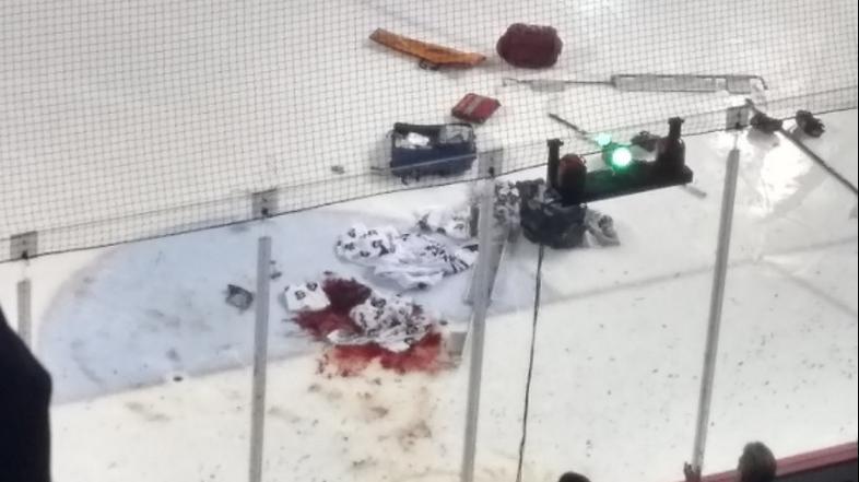 Nesrečnega vratarja so za silo oskrbeli na ledu in ga nato ob bučni podpori s tribun odnesli z nosili.