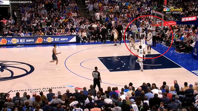 Košarkarji Dallasa so ob vrnitvi na parket stekli na napadalno polovico igrišča, medtem ko je celotna peterka bojevnikov ostala na drugi strani, kjer je po neovirani podaji iz avta žogo skozi obroč potisnil Kevon Looney.