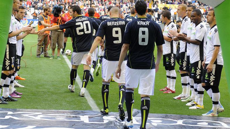 Jose Mourinho je po osvojitvi kraljevega pokala v soboto prav na Mestalli z zmago nad Barcelono tokrat tekmo začel s presenetljivo enajsterico. Portugalec, ki je tokrat ponudil priložnosti tudi mlademu, 20-letnemu branilcu Nachu Fernandezu, je (nekoliko) spočil Xabija Alonsa (ta je v igro vstopil v 62. minuti), Ronalda (vstopil v 67. minuti), Pepeja, Özila, Marcela, Arbeloa, Di Maria, Ramosa in Adebayorja, a se je Real na dvorišču Valencie še enkrat več dobro znašel. Po vratnici Karima Benzemaja v 20. minuti tekme je Francoz le tri minute kasneje načel mrežo netopirjev, potem ko si je domači čuvaj mreže Vicente Guaita privoščil napako pri izbijanju podaje Gonzala Higuaina v kazenski prostor. Benzemaju z neposredne bližine vrat ni bilo težko zadeti. Real je do vodstva z 2:0 prišel v 31. minuti po novi napaki obrambe Valencie: tokrat je zatajil Jeremy Mathieu, ki se je slabo gradil v kazenskem prostoru in Higauin mu je ukradel žogo ter rutinirano zabil. To je bil prvi gol Argentinca, ki je bil dolgo časa poškodovan, po 20. novembru 2010. Tretji zadetek v mreži varovancev Unaia Emeryja pa ni bil plod napake obrambe Valencie, ampak lepe akcije galaktikov. Po podaji Higuaina se je zadetka veselil Ricardo Kaka. Na 4:0 je s svojim drugim zadetkom na tekmi v 42. minuti po podaji Kakaja povišal prav Higuain.
