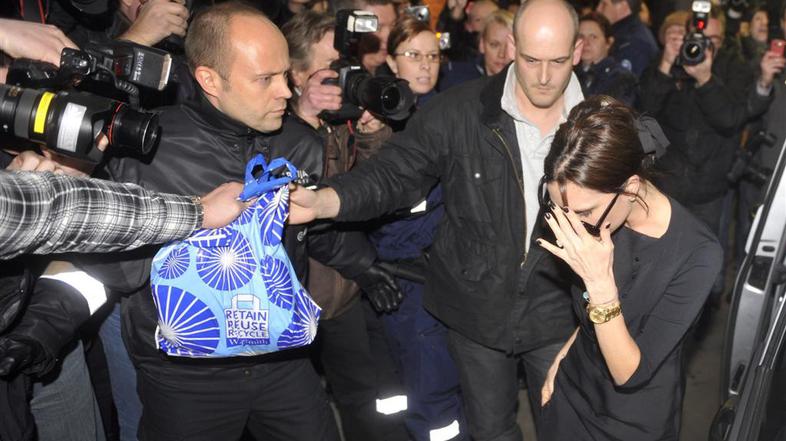 Povsem potrtemu Davidu Beckhamu se je po nesrečni poškodbi Ahilove tetive, zaradi katere bo moral izpustiti rekordno četrto svetovno prvenstvo v Južni Afriki, v bolnišnici na Finskem pridružila žena Victoria Beckham. Nekdanja članica skupine Spice Girls je v torek popoldne pristala na letališču v Turkuju in prizorišče zapustila v blindiranem Volkswagnovem kombiju. "Becks" bo v postelji ležal še en dan, mavec na nogi pa bo obdržal nekje med šestimi in osmimi tedni. Po operaciji je prvič spregovoril za javnost: