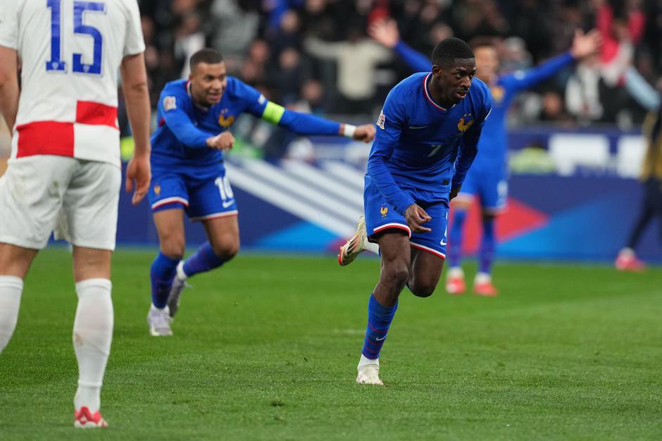 Hrvati so hud pritisk Francozov zdržali le do prvega polčasa, nato pa sta Michael Olise s prostega strela, ko je žogo poslal preko živega zida, in Ousmane Dembele poskrbela, da je bil izid identičen kot v Splitu. Tudi pri drugem zadetku je bil ključni mož Olise, ki je prodrl po desni strani, nato pa s podajo v sredino šestnajsterca našel Dembeleja, ki je ustrelil iz prve, žoga pa je mimo številnih nog končala v mreži.