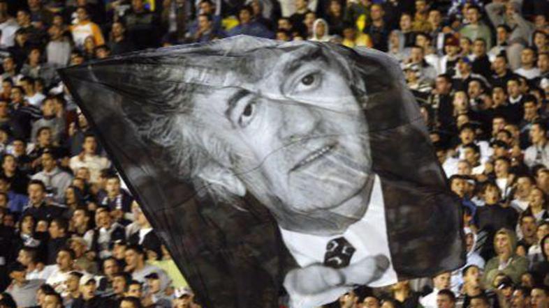 Navijači beograjskega nogometnega kluba Partizan, poznani kot Grobarji, so na prijateljski tekmi njihovih črno-belih in francoskega Lyona v Beogradu razvili zastavo s sliko Radovana Karadžića.