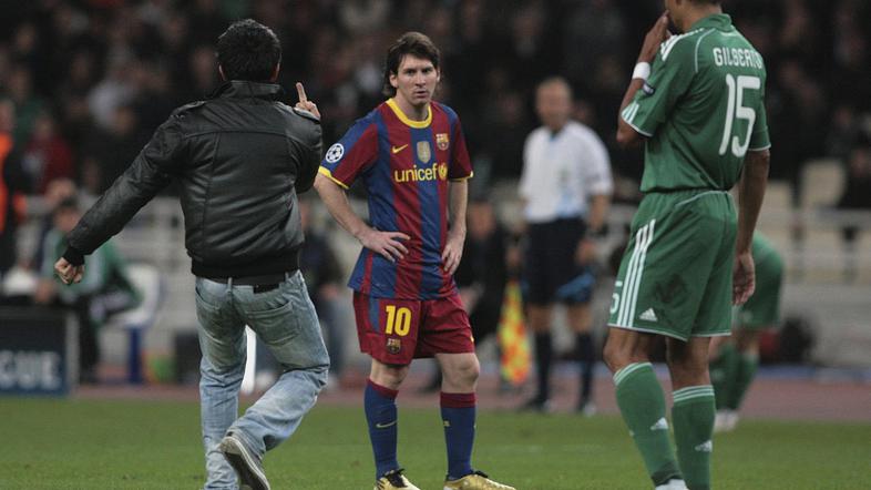 Na sredini tekmi Lige prvakov med Barcelono in Panathinaikosom, ki so jo s 3:0 dobili Katalonci, je za trenutek "zablestel" eden od gledalcev, ki je pritekel na igrišče in Messiju pokazal srednji prst.