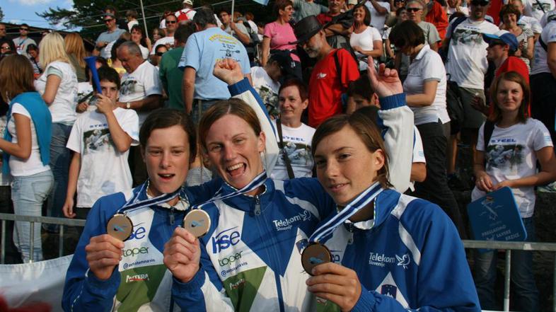 Potem ko se dopoldanski program na svetovnem prvenstvu v slalomu na divjih vodah ni izšel po željah slovenskega tabora, so popoldne za veselje na tacenskih tribunah poskrbele Nina Mozetič, Urša Kragelj in Eva Terčelj, ki so v ekipni tekmi osvojile bronasto kolajno. "Delale smo kar nekaj let. To je obliž na rane iz posamičnih voženj. Res smo vesele, da smo osvojile kolajno in prebile led pri osvajanju kolajn. Upam, da bodo jutri še naši fantje osvojili kakšno odličje. Sicer pa smo se potrudile po najboljših močeh, pokazale smo svoj optimum. Na progo smo šle z miselnostjo, da odveslamo varno, saj je proga težka in pri ekipnih tekmah si zelo izpostavljen napakam. Na koncu se je vse lepo izteklo in smo res vesele," je dejala Kragljeva. To bo lepa priložnost za slavje: "Počakale bomo jutrišnje odločitve, saj verjamem v fante in vem, da bo to izjemen dan za slovenski kajak."