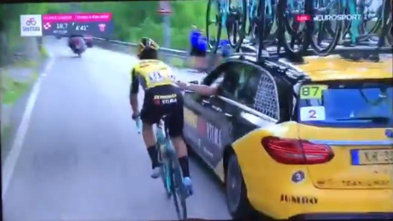 Roglič je moral po menjavi kolesa nadoknaditi približno 20 sekund zaostanka za favoriti, kar mu je tudi uspelo, a si je pri tem pomagal na nedovoljen način. Ko so mu iz moštvenega avtomobila podali bidon, naj bi ga Roglič držal nekaj trenutkov predolgo in pri tem pridobil vsaj 6 km/h.
