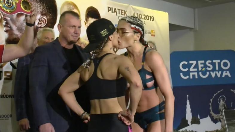 Poljakinja Ewa Brodnicka, aktualna svetovna prvakinja v super peresno lahki kategoriji po verziji WBO, je na uradnem tehtanju v mestu Częstochowa s poljubom šokirala izzivalko Edith Soledad Matthysse.