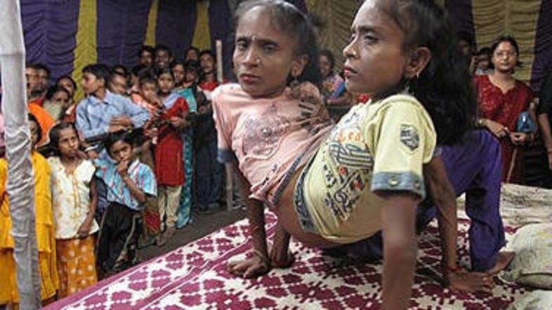 Zraščeni indijski dvojčici Ganga in Jamuna Mondal preživljata 22-člansko družino z bizarno cirkuško točko – napravljeni v pajka se plazita po odru.