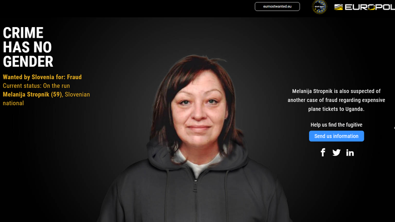 Na seznamu je tudi 59-letno Slovenka Melanija Stropnik, ki jo iščejo zaradi več primerov prevar med letoma 2000 in 2001. V enem primeru je žrtev pretentala celo za 190.000 evrov. Prav tako je obtožena prevare z dragimi letalskimi vozovnicami do Ugande.
