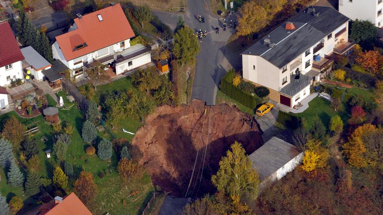V nemškem mestu Schmalkalden, 120 kilometrov stran od Frankfurta, se je danes okoli treh ponoči sredi ceste udrla zemlja in nastala je 20 metrov globoka in 30 metrov široka luknja. "Mislil sem, da nekdo ponoči opravlja nekakšna dela. Želel sem preveriti, kdo me moti pri spanju," je za Thüringer Allgemeine povedal tamkajšnji prebivalec Peter Wolfgang. "Najprej sem slišal zvok vode, nato, kako se nekaj ruši. Pogledal sem ven in pred sabo zagledal ogromen krater. Neverjetno."