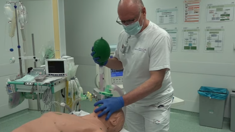 - "Intubacija pomeni vstavljanje umetne cevke v sapnik, kar pomeni, da pacienta uvedemo na umetna pljuča ali ventilator," pojasni specialist, ki vstavljanje naprave, kar seveda zahteva veliko znanja, ponazori na lutki.