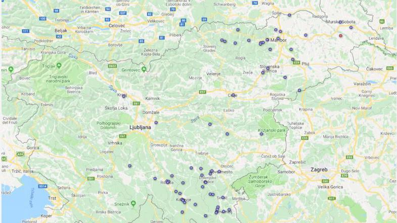Letos v Sloveniji opažamo porast primerov mišje mrzlice (hemoragične mrzlice z renalnim sindromom - HMRS). Tako so v tem letu do 19. maja laboratorijsko bolezen potrdili že pri 79 bolnikih, od tega je bilo 78 bolnikov okuženih z virusom Puumala (modra pika na zemljevidu) in 1 bolnik z virusom Dobrava (rdeča pika).