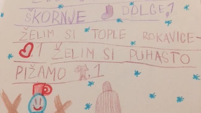 Narisala je risbico in naštela svoje želje. To so želje, samo eno mi izpolni, hvala! Električnega psa, smučarska bunda, talking angela superstars, novi zimski čevlji številka 39, velik cof, škatljica z bomboni. Hvala Dedek Mraz.
